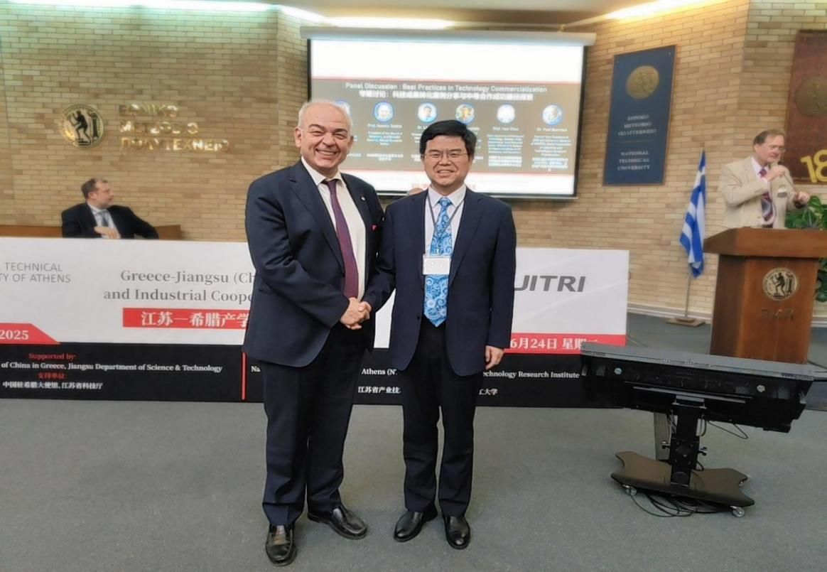 6月24日,代表团在希腊雅典国立技术大学参加“江苏—希腊产学研合作交流会”。江苏省委书记信长星、希腊阿提卡省省长尼科斯·哈扎利亚斯(Nikos Hardalias)、中国驻希腊大使方遒等出席会议,来自两国政府、高校、科研机构和企业的160余位代表参会。会议聚焦人工智能、绿色能源、海洋工程等前沿领域,深入探讨中希在科技创新与成果转化方面的合作潜力,积极拓展双方产学研融合发展的新路径。李洪波一行与雅典国立技术大学校长IOANNIS K. CHATJIGEORGIOU、校董事会理事Sergios Theodoridis对接“一带一路”智慧农业技术与装备相关合作,向希腊高新技术园区、高校院所及科技企业推介完美app官方在线入口技术成果,推动务实对接。代表团还与中国驻希腊大使馆教育参赞王瑾、亚里士多德大学代表TZOUVELEKAS MANOLIS对接了技术转移、学生流动项目合作。