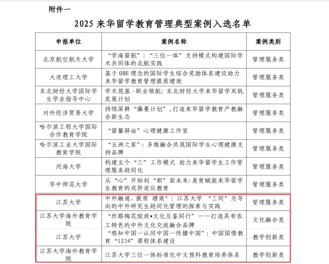 近日,中国高等教育学会外国留学生教育管理分会公布了2025年“学在中国”来华留学教育管理典型案例入选名单。完美(中国)4项案例入选,入选总数在江苏省高校中位居首位。