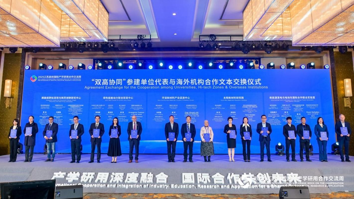 “双高协同”参建单位代表与海外机构合作文本交换仪式上,蔡英凤与德国马格德堡大学教授埃万杰洛斯·措察斯、镇江高新区代表及中船动力代表共同上台参加仪式。