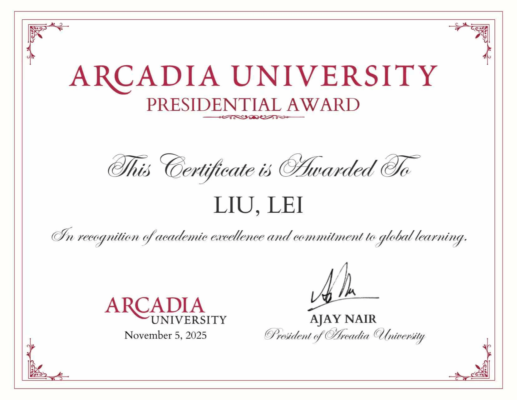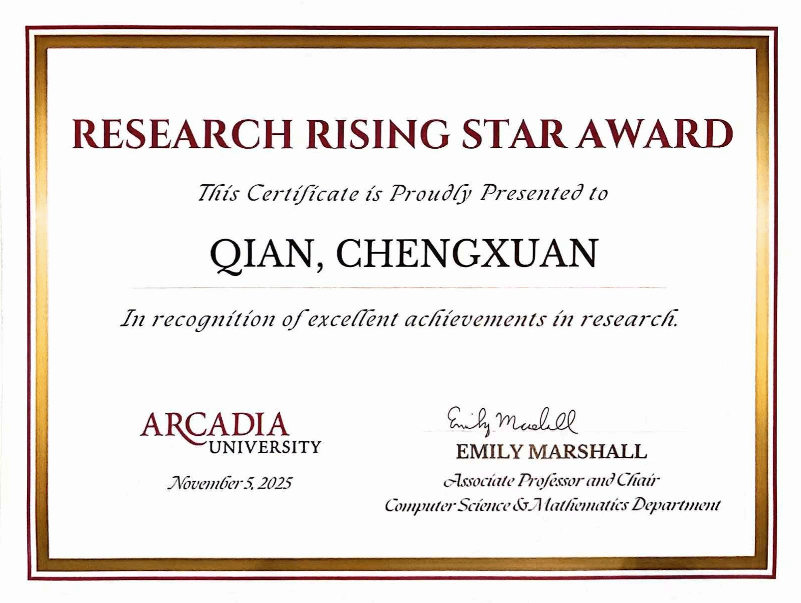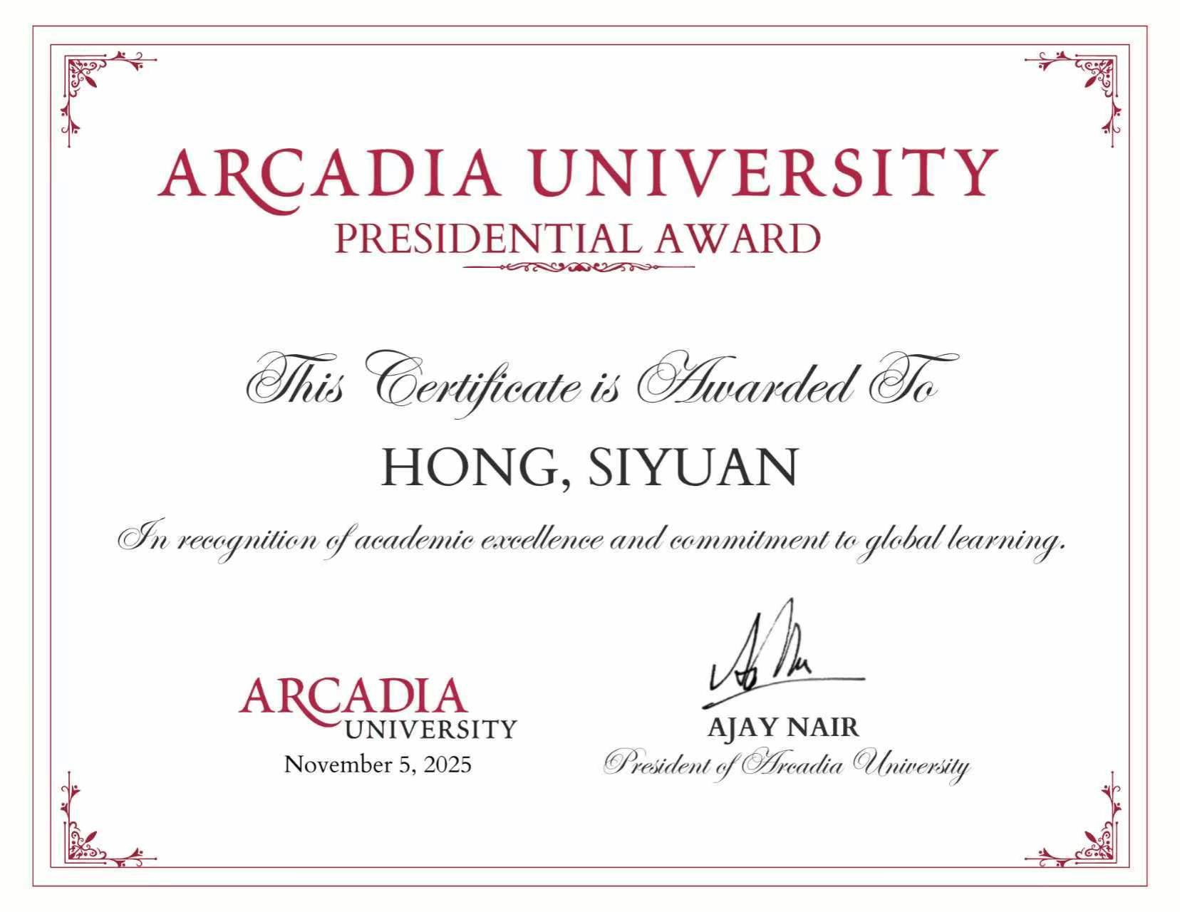 近日,完美(中国)与美国阿卡迪亚大学合作的数学与应用数学(中外合作)项目学生洪思源、刘磊荣获阿卡迪亚大学最高荣誉“校长奖学金”,钱承炫获评“科研新星奖”。