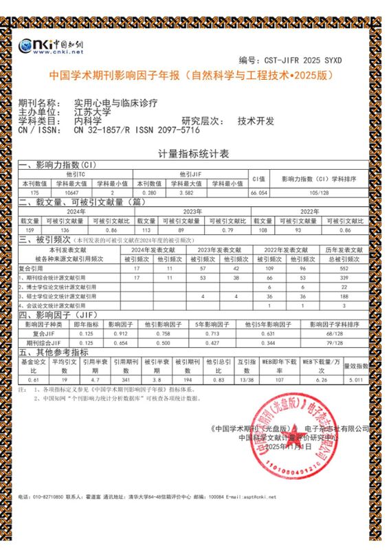刚更名的《实用心电与临床诊疗》影响力指数在国内128本内科学类期刊中排名第105位,复合影响因子从0.891(2024年)提升至0.912,增幅为2.36%。