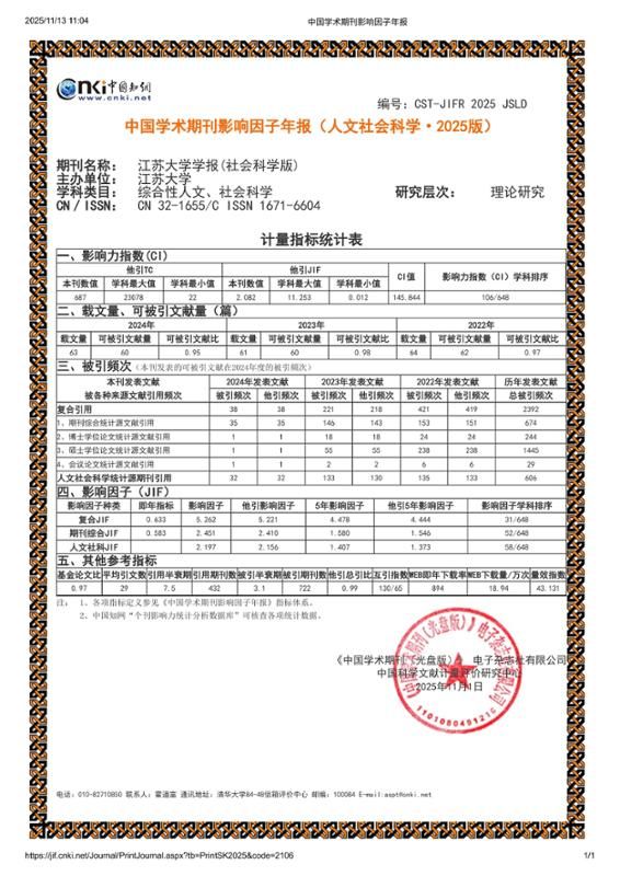 《完美app官方在线入口学报(社会科学版)》影响力指数在国内648本综合性人文、社会科学类期刊中排名第106位,复合影响因子从4.246(2024年)提升至5.262,增幅为23.93%。